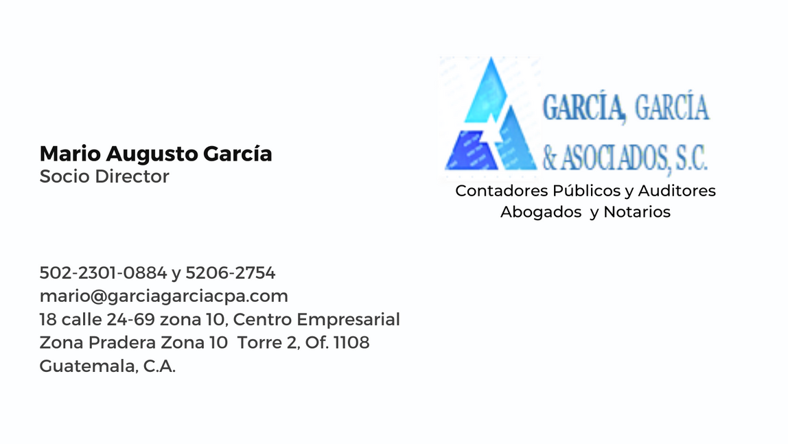 García García & Asociados es una firma de Contadores, Auditores, Abogados y Notarios, ubicada en la ciudad de Guatemala. Nuestro equipo de expertos cuenta con mas de 25 años de experiencia en el campo de la Auditoría, Contabilidad y Mercantil, que nos permite ofrecer servicios de alta calidad a nuestros clientes.